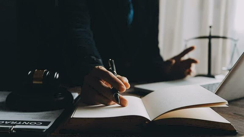Justice and law concept.Male judge in a courtroom with the gavel, working with, computer and docking keyboard, eyeglasses, on table in morning light Free Video