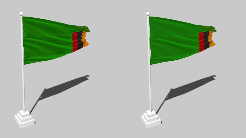 Zambia Flag Seamless Looped Waving with Pole Base Stand and Shadow, Isolated on Alpha Channel Black and White Matte, Plain and Bump Texture Cloth Variations, 3D Rendering Free Video