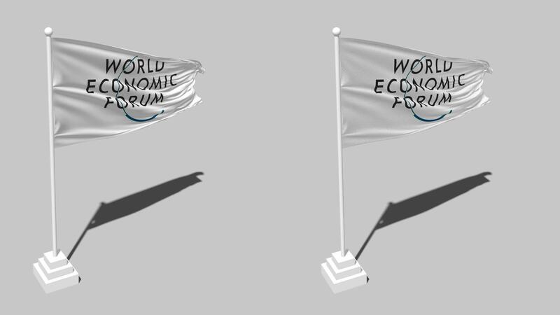 World Economic Forum, WEF Flag Seamless Looped Waving with Pole Base Stand and Shadow, Isolated on Alpha Channel Black and White Matte, Plain and Bump Texture Cloth Variations, 3D Rendering