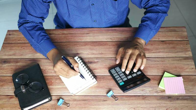top view of man hand using calculator and writing on notepad Pro Video