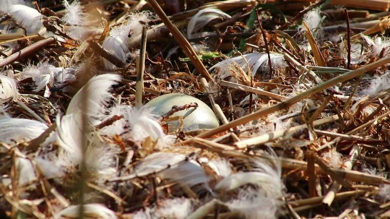 Eggs of a graceful white swan breeding in nest with eggs as white cygnus at lake shore in mating and breeding season hatching his eggs to keep them warm and hatch out little swans in close-up egg view Free Video