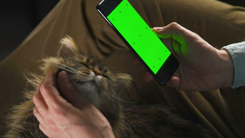 Man using smartphone with green mock-up screen in vertical mode and stroking the fluffy cat. Man browsing Internet Pro Video