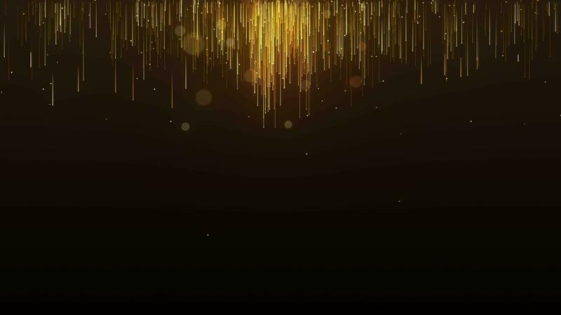 Abstract elegant golden glowing lines falling with glowing lighting effect and bokeh effect on black background. Dust sparkle golden particles rain. Pro Video