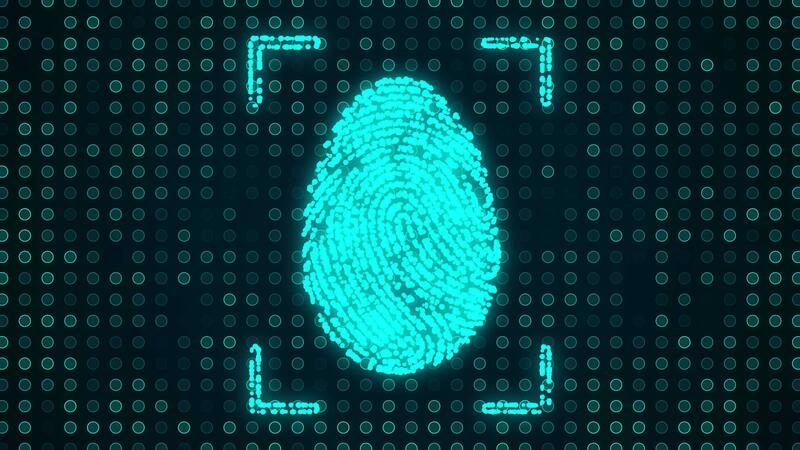 Digital fingerprint or thumb fingerprint scan icon made of moving blue glowing particles on technological sky blue dots background. Concept of touch ID, unlocking apps or smartphone, secure access Pro Video