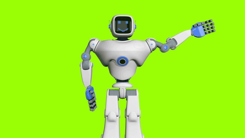 Front view of white and blue human-shaped robot with happy face waving with its left arm and turning its head from left to right against green background. 3D Animation Pro Video