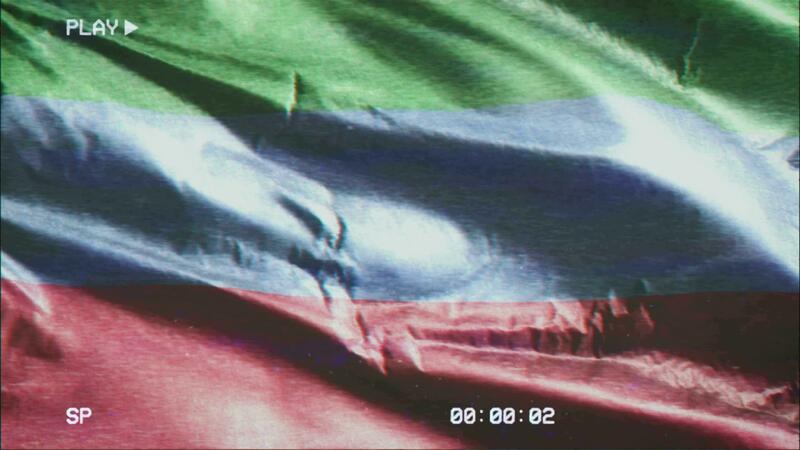 VHS video casette record Dagestan flag waving on the wind. Glitch noise with time counter recording banner swaying on the breeze. Seamless loop. Pro Video