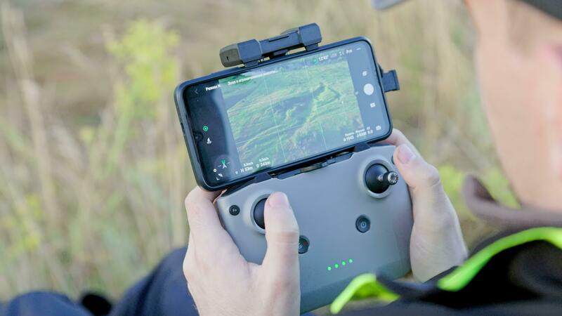 drone operator hands using remote control with sticks and cellphone as monitor at daylight Pro Video