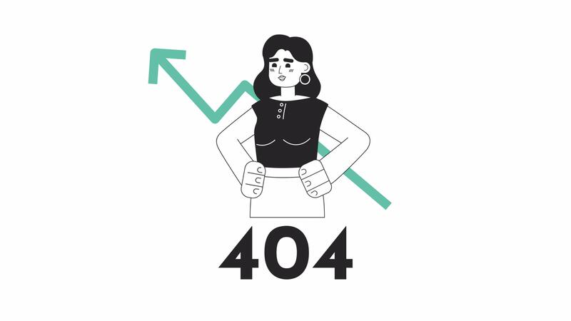 Happy trader with growing arrow bw error 404 animation. Growing stock error message gif, motion graphic. Profit increase. Purposeful animated character outline 4K video isolated on white background Pro Video