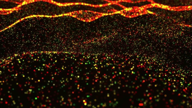 Orange green yellow red flowing moving on waved surface. Cyber sea waves floating dots background. Global network slow waving ocean concept backdrop. Abstract wavy data space creative motion design. Pro Video
