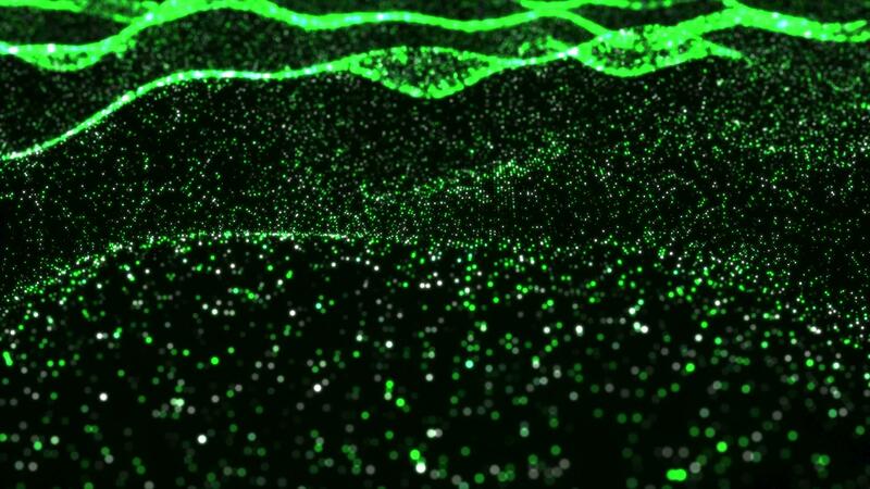 Green flowing moving on waved surface. Cyber sea waves floating dots background. Global network slow waving ocean concept backdrop. Abstract wavy data space creative motion design. Pro Video