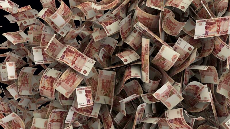 Dynamic Russian Ruble money bills transition from the side and exploding Pro Video