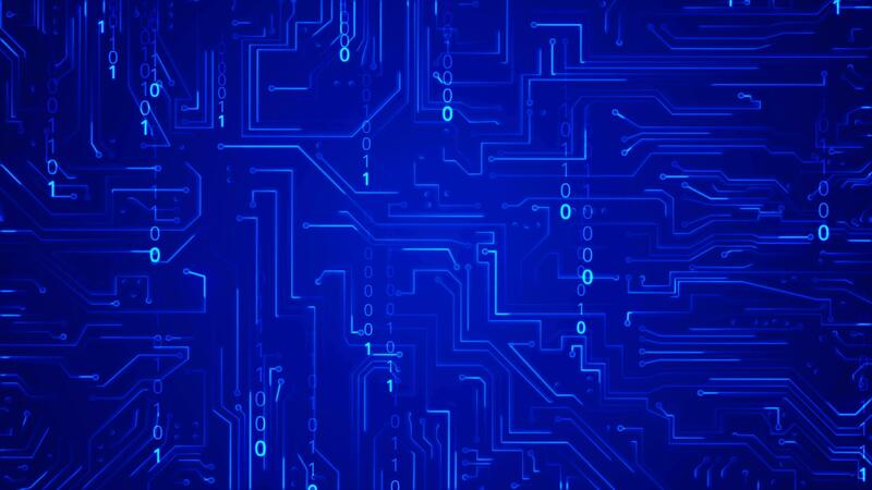 Circuit board connection and falling down binary code on blue background. Digital rain of binary numbers. Numbers flowing between lines. Moving electrons on motherboard. Internet technology concept. Pro Video