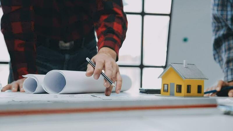 Construction and structure concept of engineer working drawing on blueprint meeting for project working with partner on model building and engineering tools in working site, construction concept. Free Video