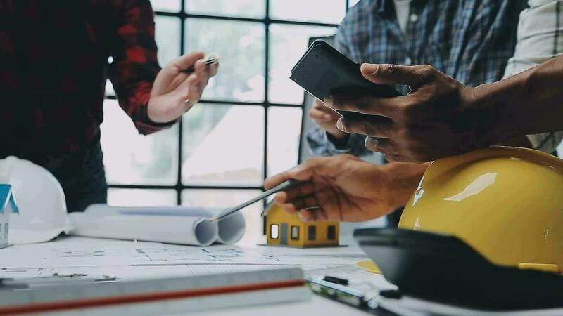 Construction and structure concept of engineer working drawing on blueprint meeting for project working with partner on model building and engineering tools in working site, construction concept. Free Video