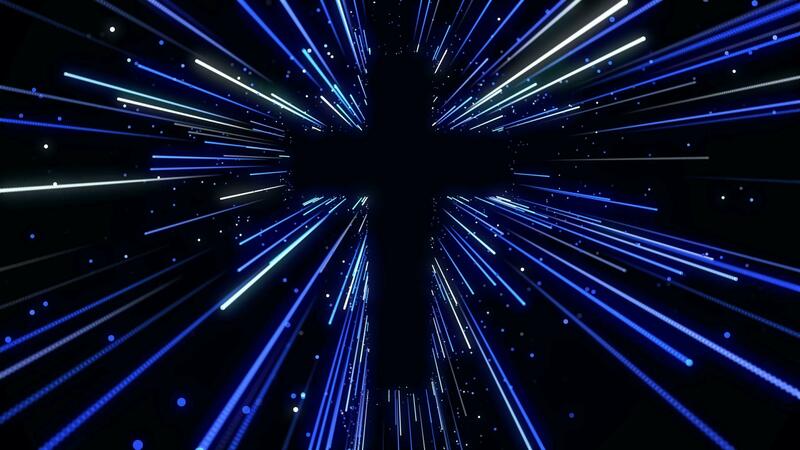 High blue floating glowing color sunburst rays from cross of jesus christ shape background loop. Pro Video