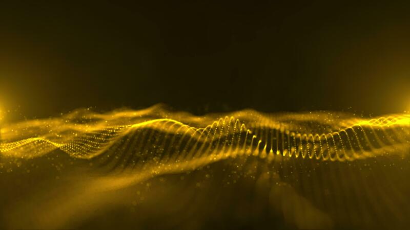 Background with an elegant flowing golden digital fractal light wave and data particles rippling towards the camera. This abstract technology background animation is full HD and a seamless loop. Pro Video