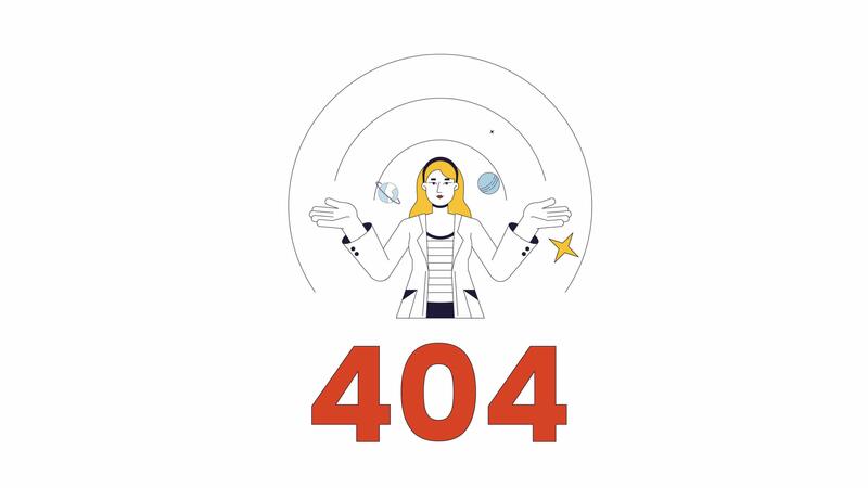 Rocket scientist presenting orbit planets 404 error animation. Rocket launch error message gif, motion graphic. Engineer cosmos animated cartoon line character 4K video isolated on white background Pro Video
