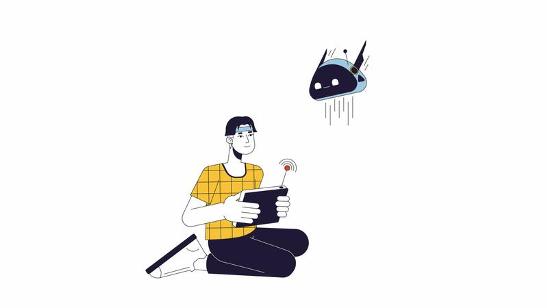 Robotics engineer operating robot drone line 2D character animation. Testing flat color cartoon 4K video, alpha channel. Korean man controlling robotic head flying animated person on white background Pro Video