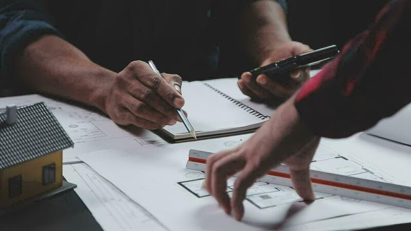 Construction and structure concept of engineer working drawing on blueprint meeting for project working with partner on model building and engineering tools in working site, construction concept. Pro Video
