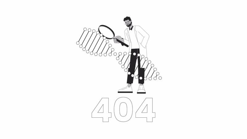 Scientist studying dna strand rotating black and white error 404 animation. Error message gif, motion graphic. Researcher with magnifying glass animated character linear 4K video isolated on white Pro Video