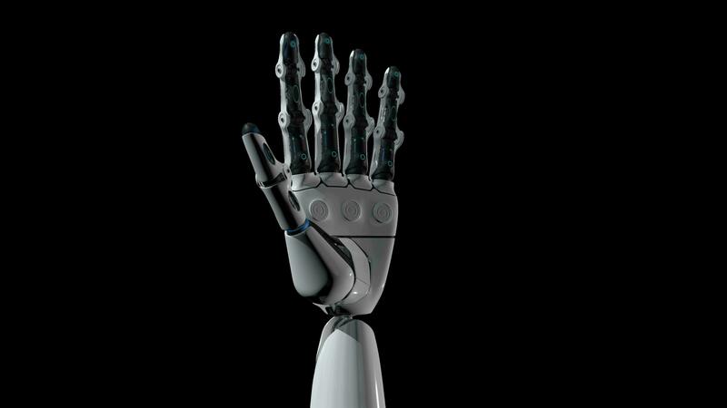 Close up of human shaped robot hand moving fingers on black background while camera rotates 360 degrees. Loop sequence. 3D Animation Pro Video