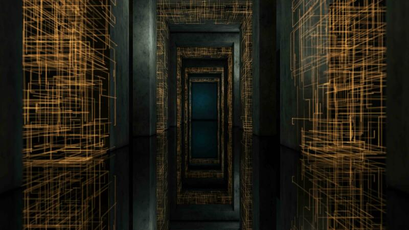 Go though the dark tunnel with golden circuit lines, 3d rendering. Pro Video