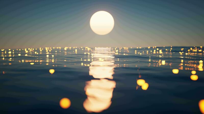 Loop animation of rippled lake with glowing particles, 3d rendering. Pro Video