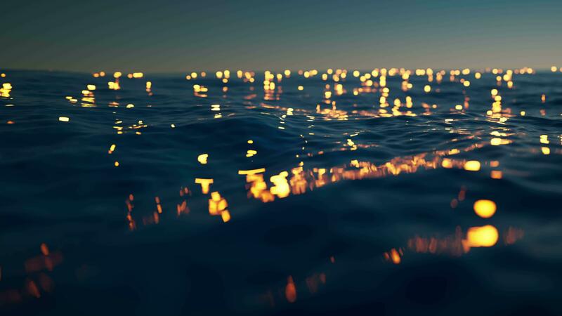 Loop animation of rippled lake with glowing particles, 3d rendering. Pro Video