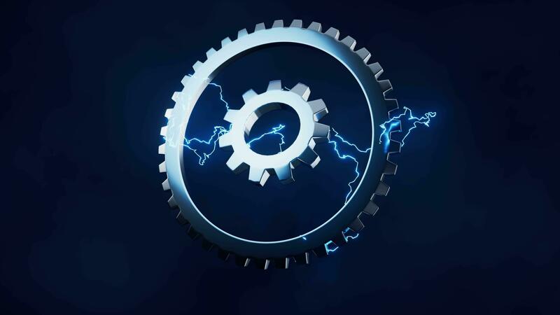 Loop animation of gears with lightning effect, 3d rendering. Pro Video