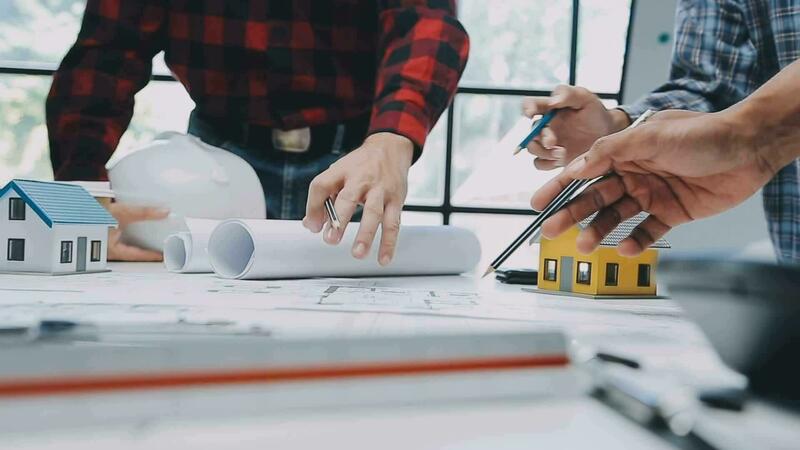 Construction and structure concept of engineer working drawing on blueprint meeting for project working with partner on model building and engineering tools in working site, construction concept. Free Video