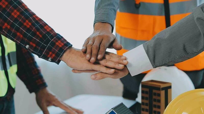 Construction and structure concept of engineer working drawing on blueprint meeting for project working with partner on model building and engineering tools in working site, construction concept. Free Video