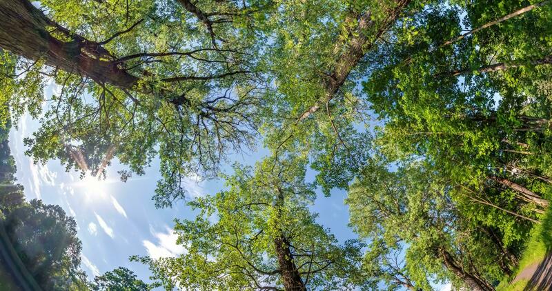 spinning and torsion and underneath tall forest with clumsy branches. Trees growing in the sky with loop rotate Pro Video