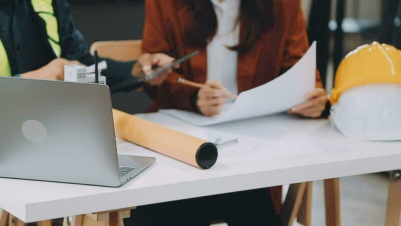 Construction and structure concept of Engineer or architect meeting for project working with partner and engineering tools on model building and blueprint in working site, contract for both companies. Free Video