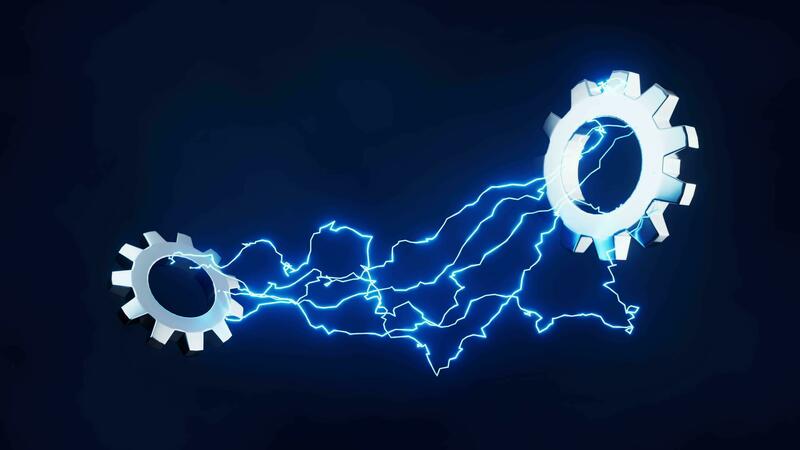 Loop animation of gears with lightning effect, 3d rendering. Free Video