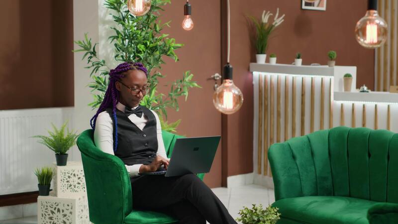 Front desk staff working on laptop in lobby, creating list of guests with room reservations to ensure easy check in process and pleasant stay. African american employee at luxurious hotel. Pro Video