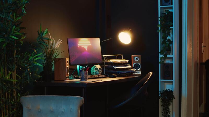 Close up shot of computer screens showing running animation rendering in dimly lit empty home interior. Zoom in on 3D renders on digital displays in cozy apartment living room Pro Video