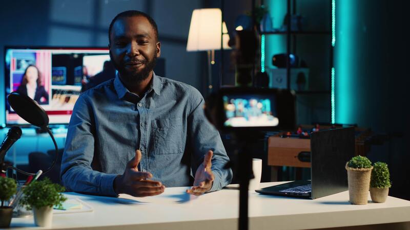 Smiling content creator using professional recording devices in cozy studio to film video intro for online streaming platforms. Influencer greets fanbase, doing monologue about topic Pro Video