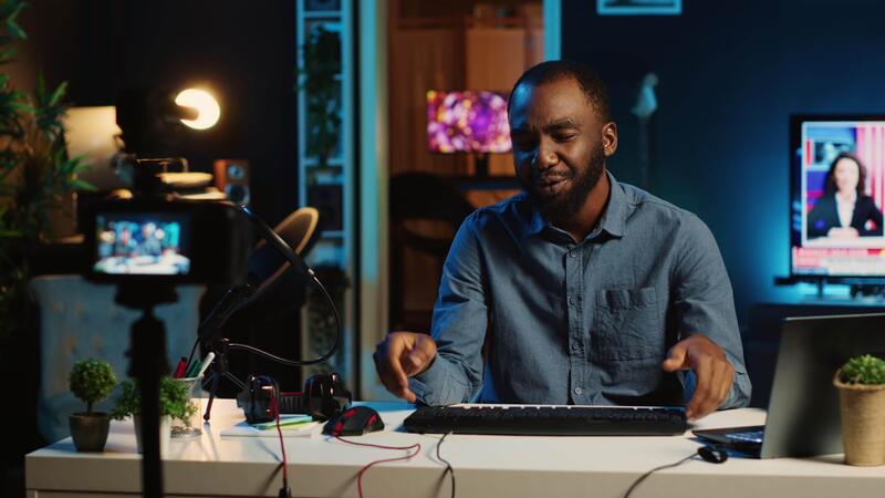 Content creator in studio films wired keyboard, mouse and headphones video review for tech enthusiasts. Viral online star hosts technology internet show, unboxing computer peripherals devices Pro Video
