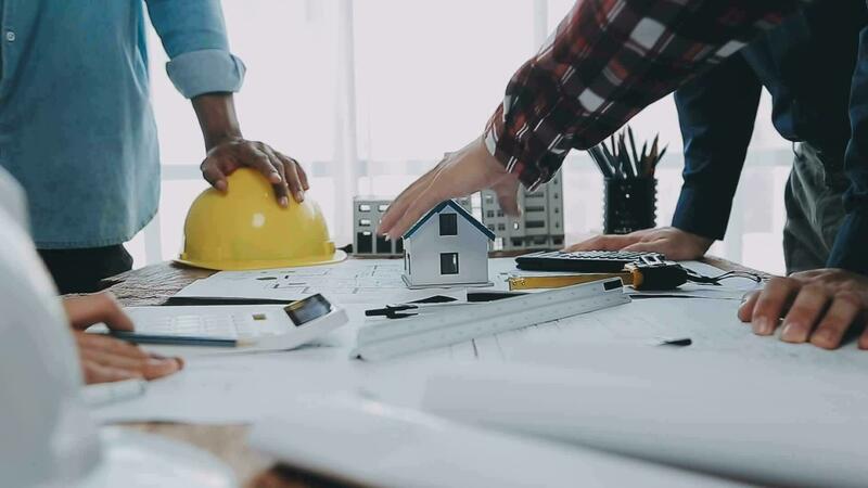 Architectural engineer team meeting Use of blueprints, construction drawings and calculations for architectural projects and engineering tools in the workplace technical structure concept. Pro Video