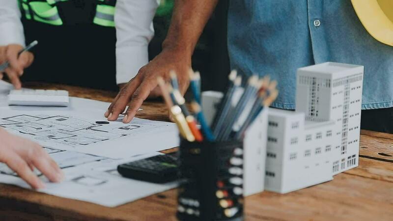 Architectural engineer team meeting Use of blueprints, construction drawings and calculations for architectural projects and engineering tools in the workplace technical structure concept. Free Video