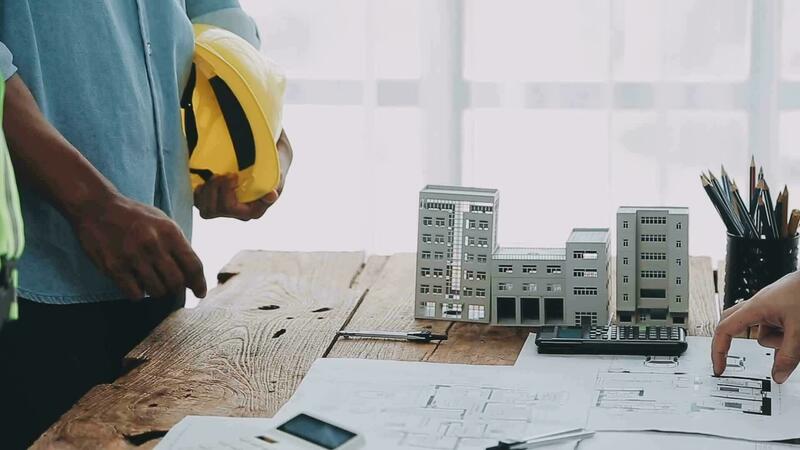 Architectural engineer team meeting Use of blueprints, construction drawings and calculations for architectural projects and engineering tools in the workplace technical structure concept. Free Video