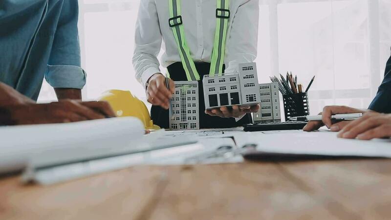 Architectural engineer team meeting Use of blueprints, construction drawings and calculations for architectural projects and engineering tools in the workplace technical structure concept. Free Video