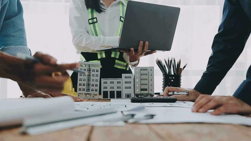 Architectural engineer team meeting Use of blueprints, construction drawings and calculations for architectural projects and engineering tools in the workplace technical structure concept. Free Video
