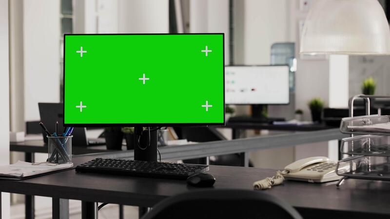Empty desk with computer shows greenscreen on monitor, running blank mockup copyspace in business office. Workstation in open floor plan office with pc and isolated chromakey template. Pro Video