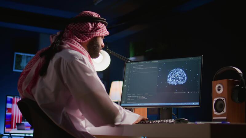 Developer typing on keyboard, updating artificial intelligence neural networks, writing complex binary code scripts. Muslim freelance programmer in personal office upgrading high tech AI Pro Video