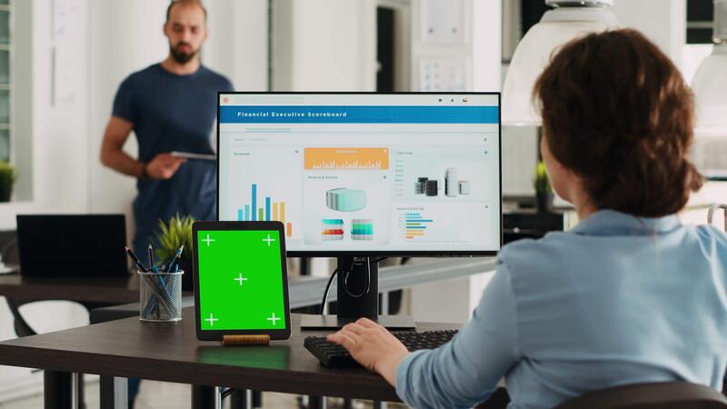 Business person using pc at workstation, having greenscreen display template on tablet in front of her. Manager planning startup operations and checking isolated mockup layout on device. Pro Video