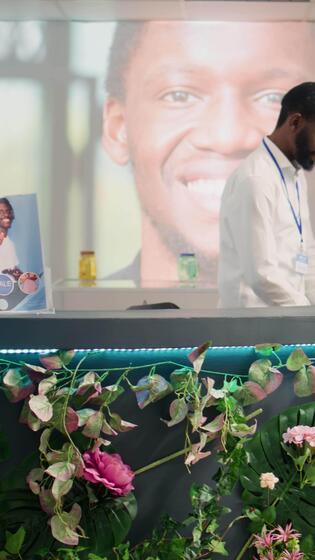 Vertical video African american man checking past customers transactions in thrift shop at checkout counter and taking clothes delivery orders. Cashier in empty second hand store crosschecking data Pro Video