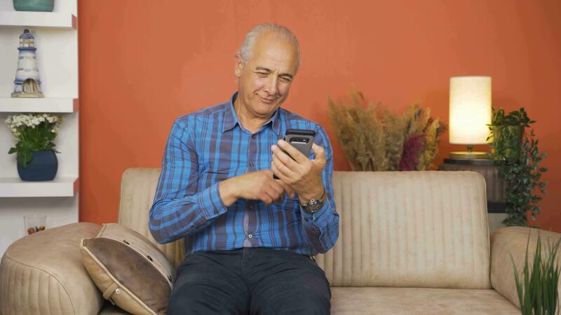 Man using phone with happy expression. The man is enjoying it. Pro Video