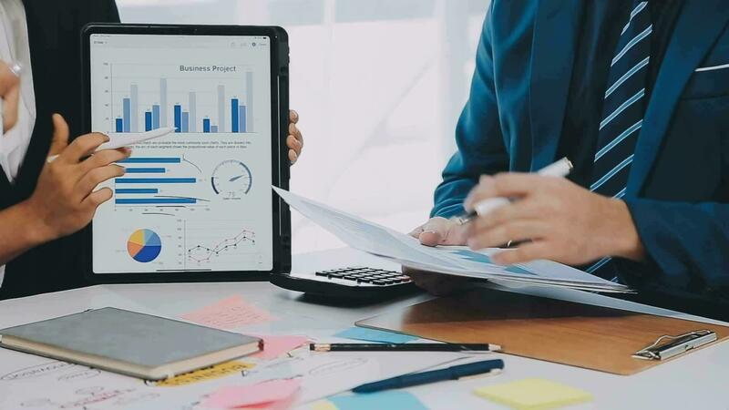Two creative business people meeting and planning use post it notes sticky note on desk to share idea, Analysis data chart and graph with teamwork strategy brainstorming in office. Free Video
