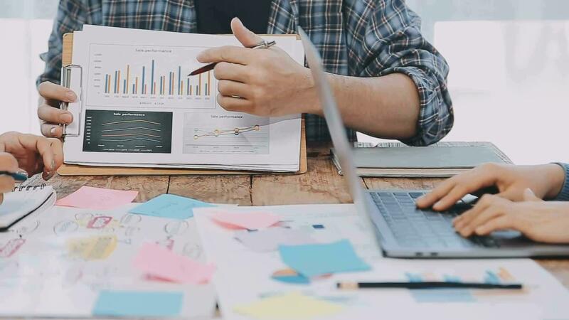 Two creative business people meeting and planning use post it notes sticky note on desk to share idea, Analysis data chart and graph with teamwork strategy brainstorming in office. Free Video